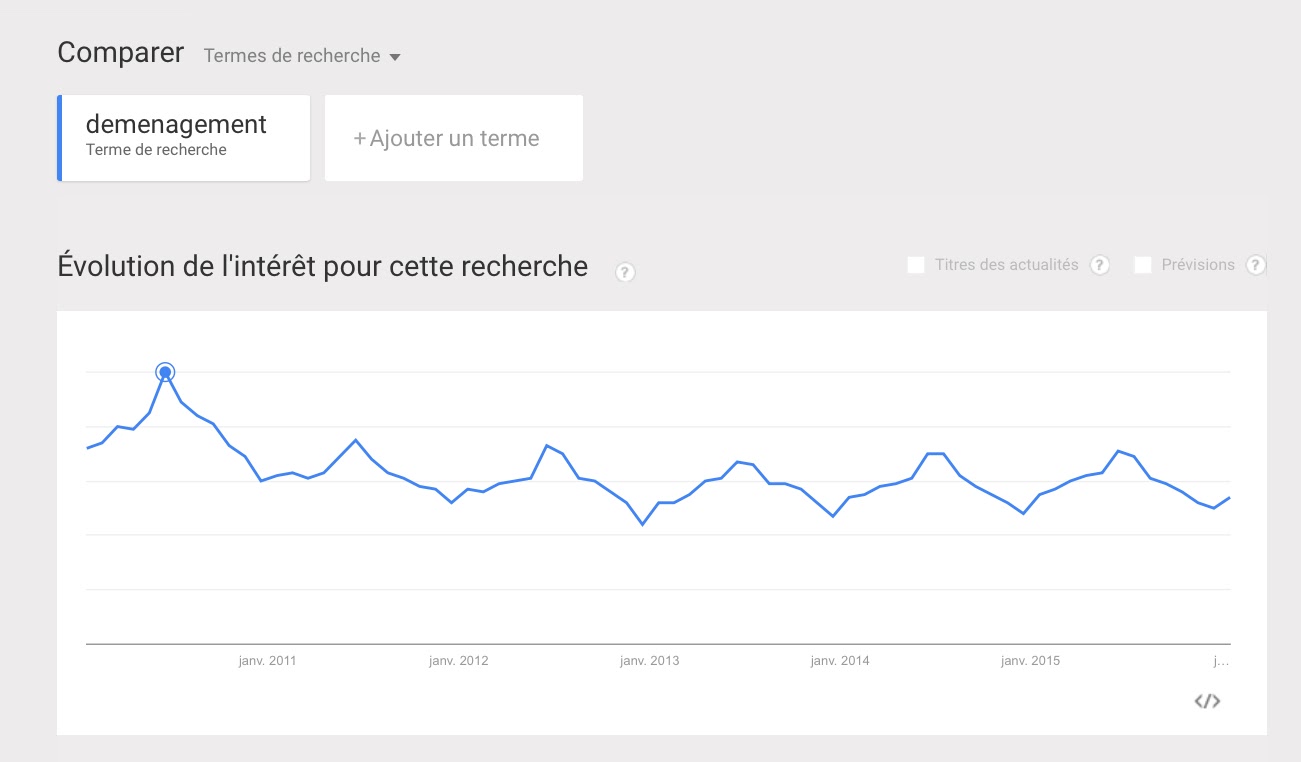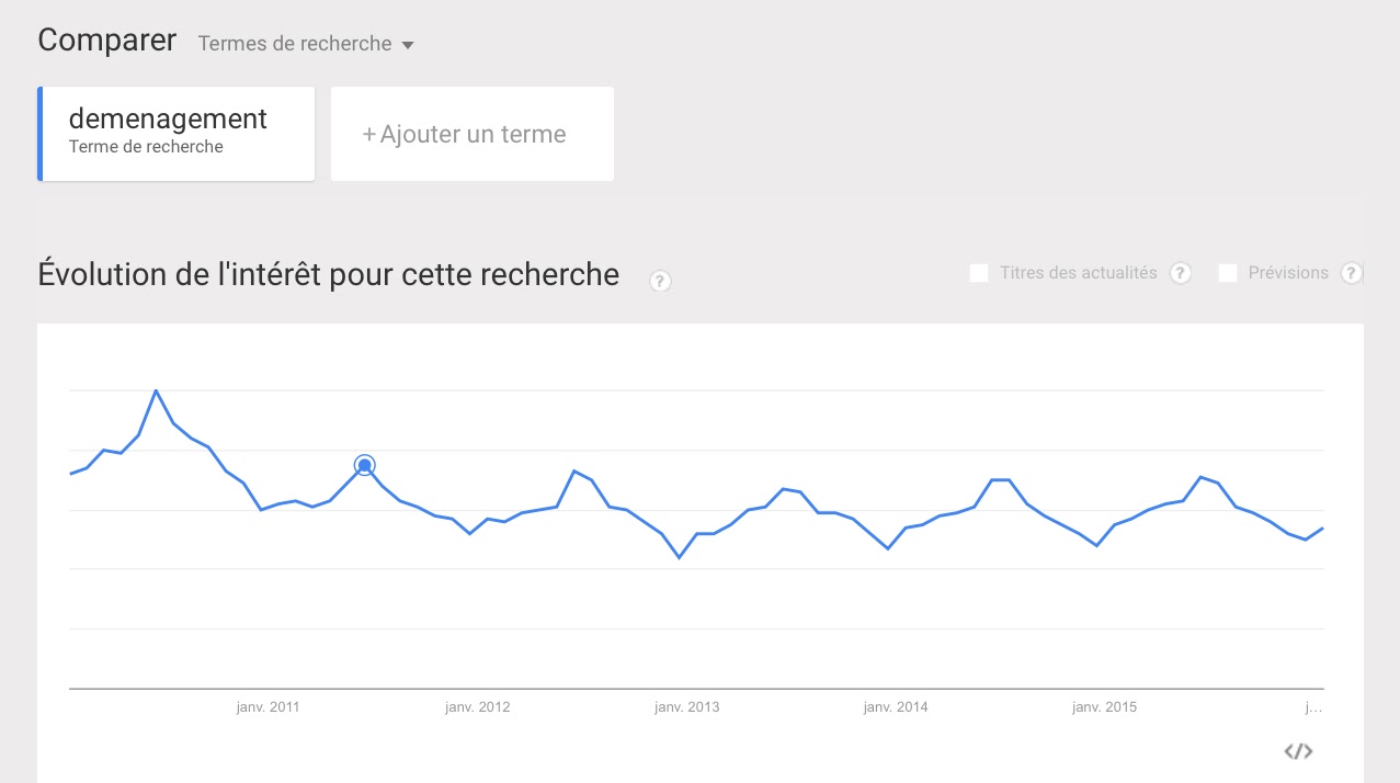 Dernière statistique en date : janvier 2016, le mot clé déménagement est à 54% par rapport à juillet 2010.